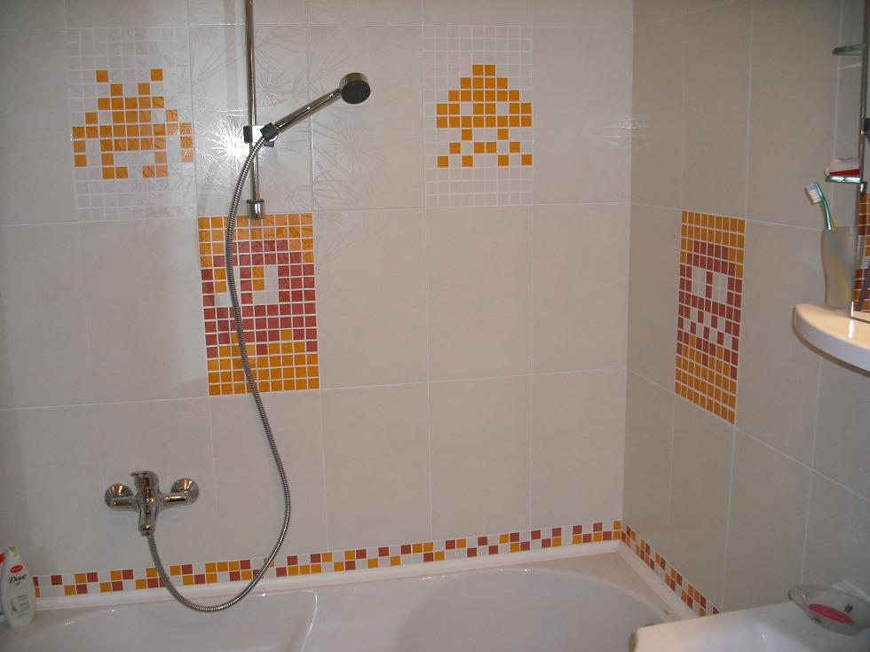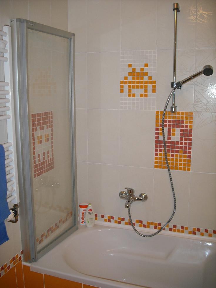 Tak me to delali zednici, jen mi rekli, kolik se vejde mozaikovych kosticek misto klasicke kachlicky a ja jim pak donesl vytisknuty papir s navrhem. Kamos mi rikal, ze si mam dat na stenu celou obrazovku ze hry Space Invaders, ale to by me asi zabili zednici i pritelkyne .