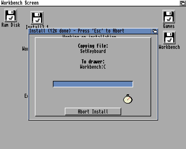 - Workbench 3.1 (Disk 2) – průběh instalace 12%