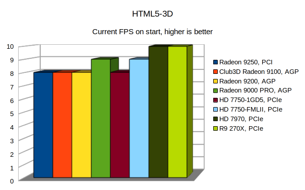 Nejrychlejší je Radeon 9000 PRO se 16 FPS, následován R9 270X s 15 FPS a Radeon 9520 s HD 7750 14 FPS. Výsledky jsou tedy dost stejné.