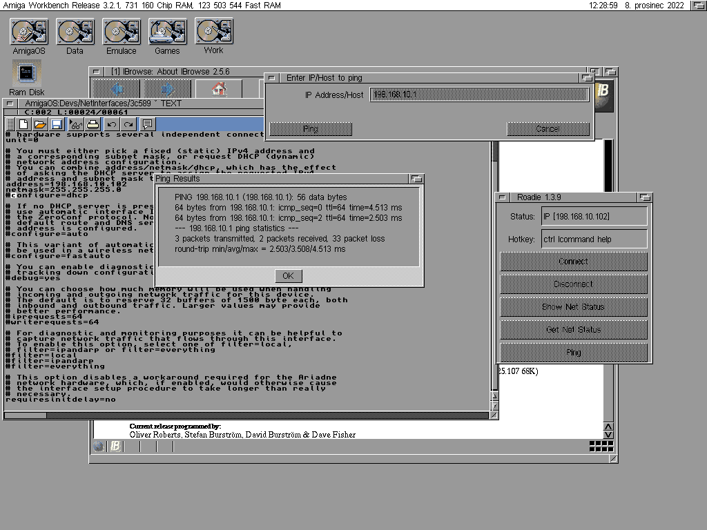 Případně můžeš Amigu propojit na přímo s PC (nevím jestli u téhle staré karty nebude potřeba crossover kabel) a použít Wireshark a podívat se na provoz na kabeluAmiga 4000T (060, PPC, Mediator) | Amiga 1200T (Apollo 1240) | Amiga 1200T (Apollo 1260, Mediator) | Amiga 1200 (TF1260) a pár dalších A1200 ...
