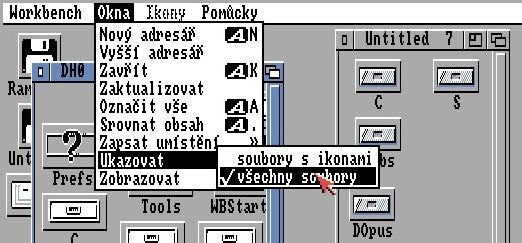 Ještě před kopírováním otevřete okno disku DH0: a najedeme na horní lištu systému, přes pravé tlačítko myši povolíme Okna / Ukazovat / všechny soubory, což nám ukáže na první pohled skryté soubory. Na druhý pohled jde ale o soubory, které nemají vytvořenou ikonku (resp. soubor, který má stejný název + koncovku .info) a proto nám je GUI neukazuje.