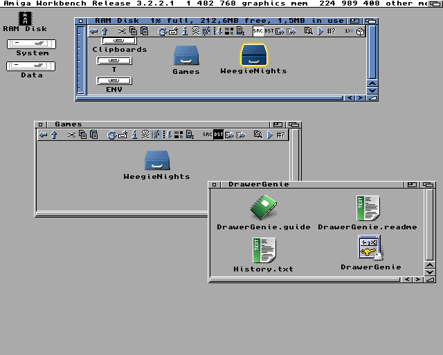 DrawerGenie je určena pro Workbench 3.5 a novější, funguje i v 3.2 a určitě stojí za vyzkoušení. Utilita je ke stažení z Aminetu nebo z autorova profilu na itch, kde mu můžete za jeho snahu vyhubovat, pochválit nebo jej i podpořit malou částkou. Co vy na to, jak se vám líbí?