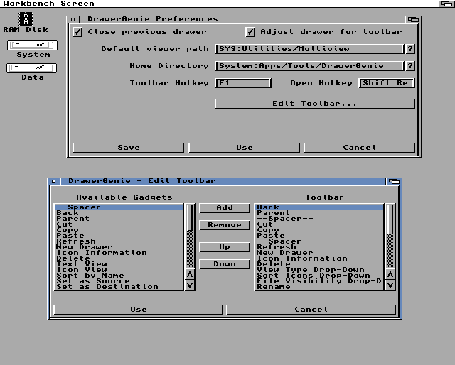 Jak utilita funguje: můžete ji spustit klasicky jako jakýkoli jiný program až když ji chcete používat, nebo je možné ji dát do WBStartupu, kde se sama aktivuje při příštím spuštění systému. Po aktivaci utility DrawerGenie a otevření okna se nic neděje, nástrojová lišta se sama nevnucuje, ale když o ní máme zájem, spustíme ji v aktivním okně klávesou F1. Takto můžeme konat v jakémkoli jiném okně.