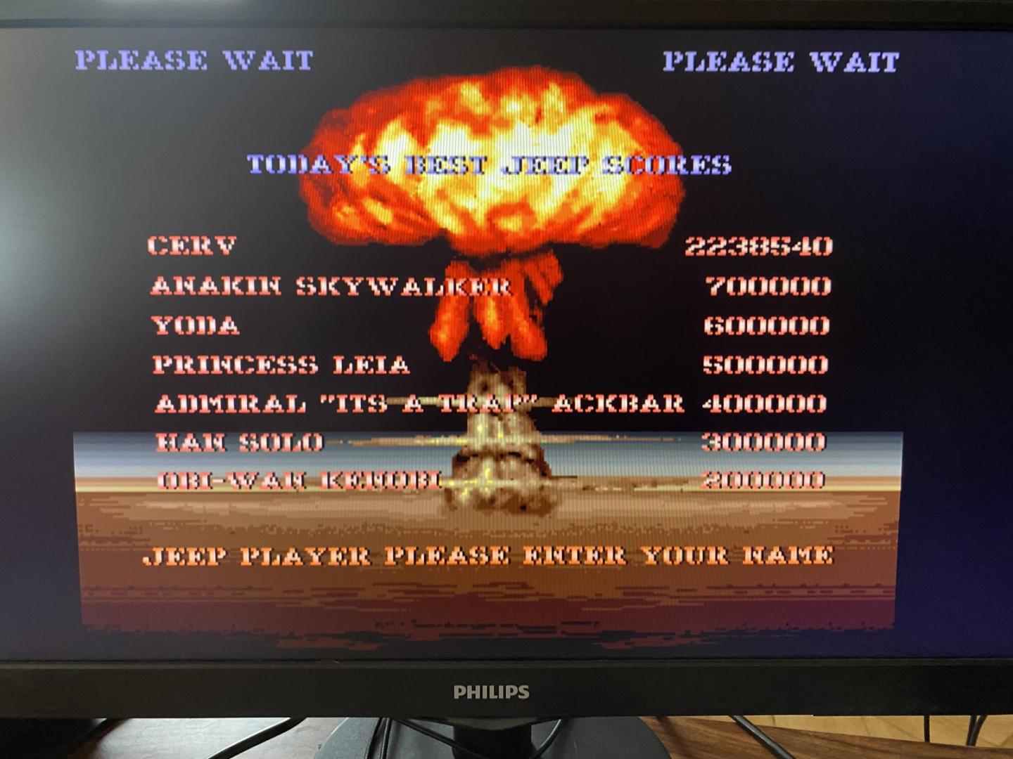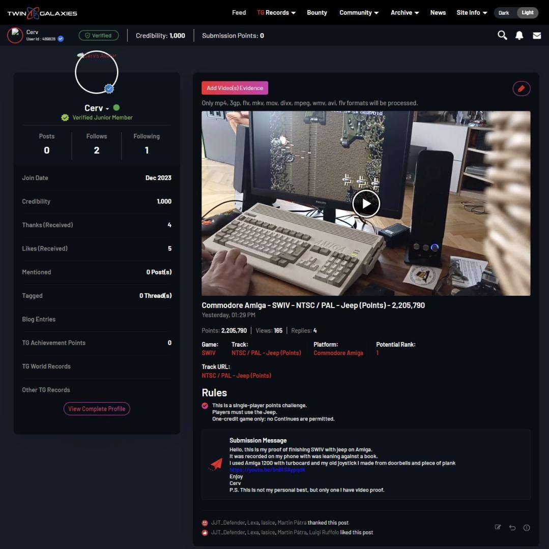 Vybral jsem si, jak jinak, SWIV s jeepem. Na Twin Gallaxies bylo něco přes 2 M bodů ( 2.084.580 )​a v pravidlech, že se musí hrát bez continue a pochopitelně z hraní pořídit záznam...