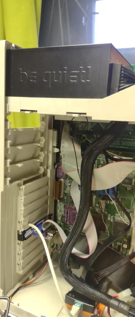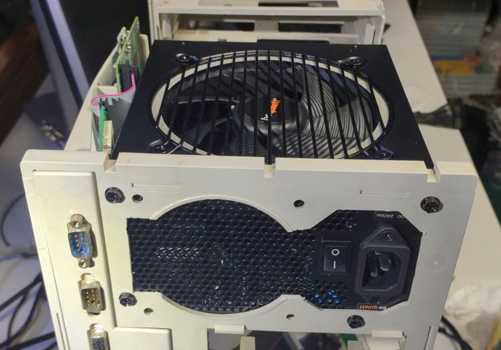 Pěkný, osobně bych ten zdroj viděl spíše obráceně větrákem dolů, protože ten prostor po zakrytovaní Amigy u toho větráku vnímám jako ne zcela vyhovující a zároveň by tak větrák odváděl teplo i z Amigy pryč, co bych vnímal jako vedlejší vlastnost. Priorita by byla u mně ten prostor před větrákem.