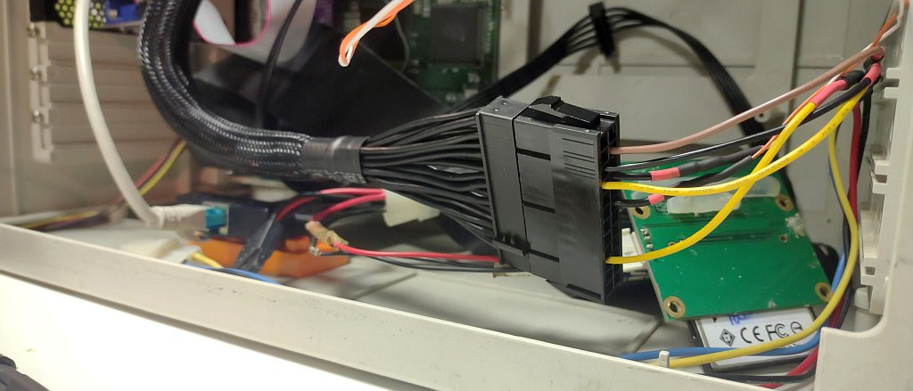 Na třetím obrázku je vidět zapínací redukce pro ATX zdroj. Piny nalisované na kabelu jsem zkanibalizoval z převodky napájení pro grafickou kartu (molex na 8pin PSU)