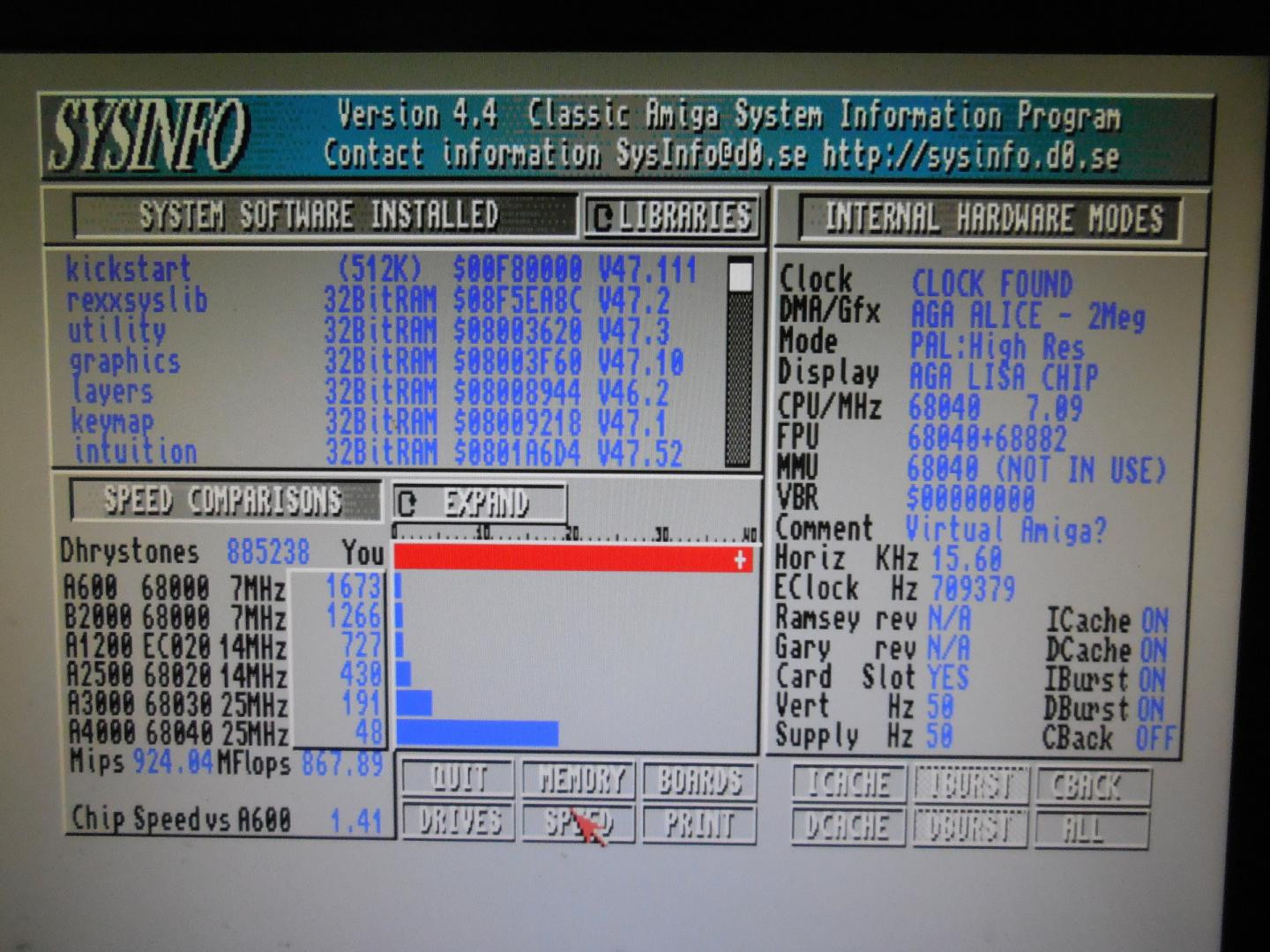 Tak jsem to teď zopakoval v několika konfiguracích a výsledky jsou níže. Je to program přeloženej pro 68k, tzn. není to optimalizované pro vyšší procesory. To ještě plánuju překompilovat v dalším kroku...
