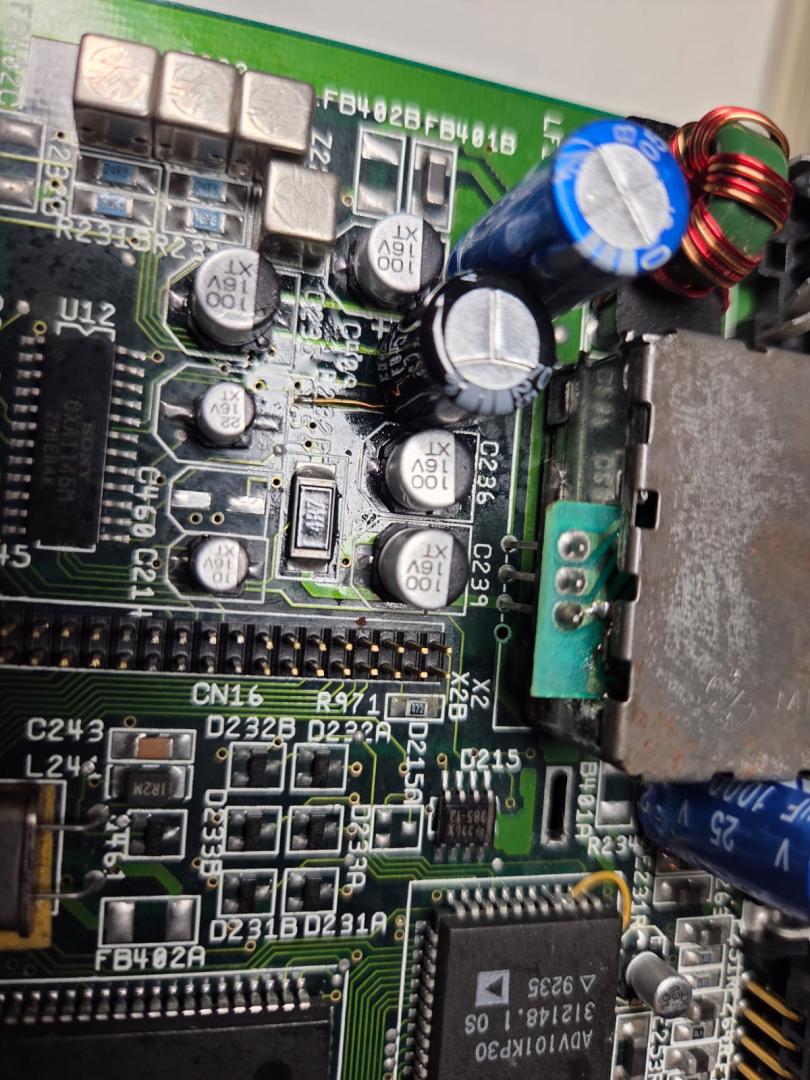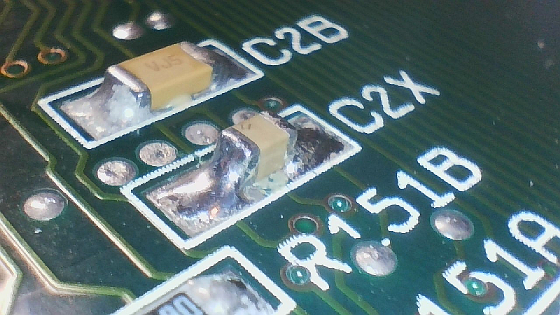 Dva kondenzátory (470uF) jsem vyměnil, protože měli špatnou rozteč. K jednomu jsem přidal pro jistotu smaltovaný drátek a přestříkal to polyuretanovým izolačním lakem. Odsál jsem přebytečný cín. Vyměnil poškozené rezistory R325 a 335. Nicméně to vše vůbec nepomohlo. Po asi 3 minutách se při boot animaci v místě obdélníku animace ukázaly rolující se artefakty a pak se to restartovalo a po pár restartech bylo černo.