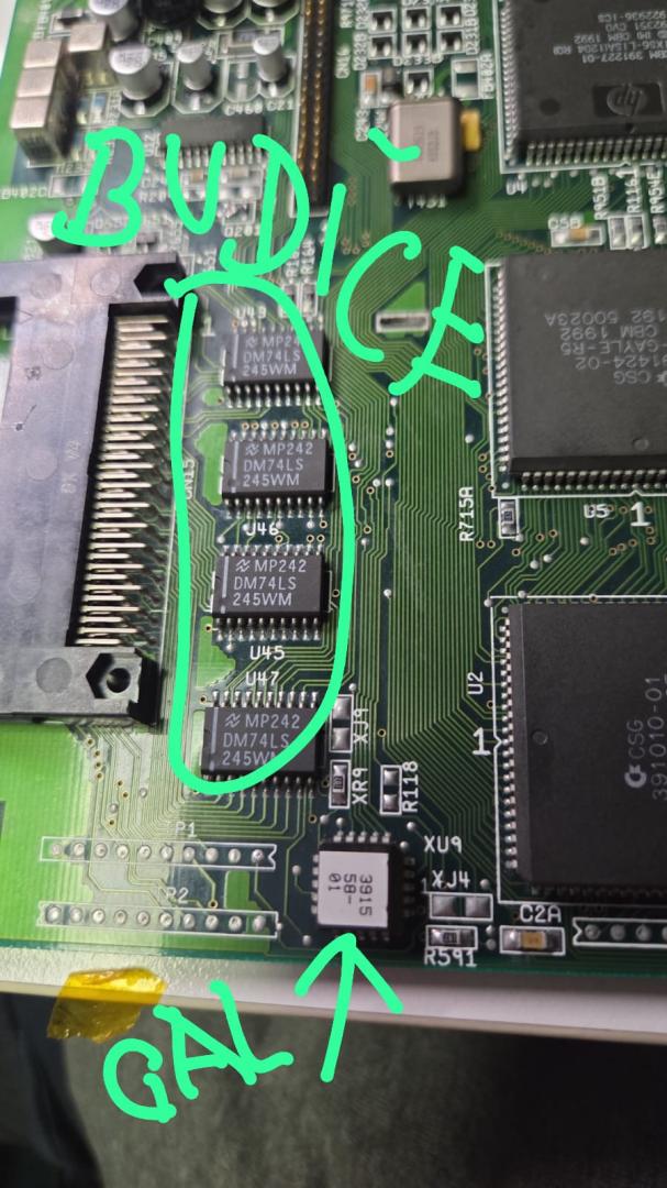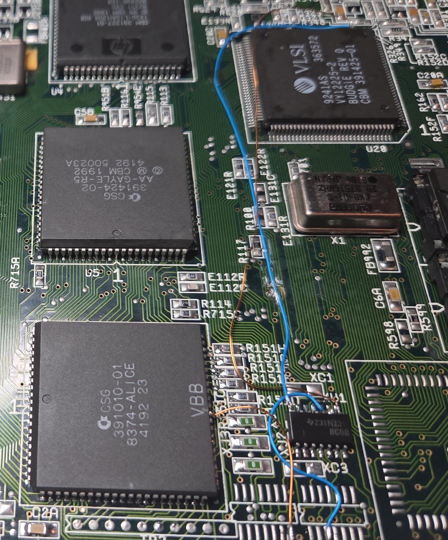 Dva kondenzátory (470uF) jsem vyměnil, protože měli špatnou rozteč. K jednomu jsem přidal pro jistotu smaltovaný drátek a přestříkal to polyuretanovým izolačním lakem. Odsál jsem přebytečný cín. Vyměnil poškozené rezistory R325 a 335. Nicméně to vše vůbec nepomohlo. Po asi 3 minutách se při boot animaci v místě obdélníku animace ukázaly rolující se artefakty a pak se to restartovalo a po pár restartech bylo černo.Vypadalo to, že je něco s Alicí. Také se ohříval hodně GAL vedle Alice, který opravuje chyby časování Alice a přidává wait staty pro ROM a k tomu se ještě ohřívaly budiče sběrnice pro PCMCIA kartu. Když jsem Alici ochladil kompresorem, tak to vydrželo bez chyb, restartů a zaseknutí delší dobu. Hodiny CCK (viz foto z osciloskopu) a CCKQ byly v pohodě, při artefaktech se zvýšily asi o 0.1 V. Zvažoval jsem, že zkusím vzít Alici z jedné Amiga desky co tu mám, ale nechtěl ji již po 2 a po 3 tepelně namáhat.