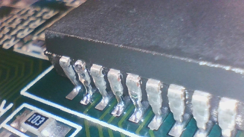 A ejhle, Amiga naběhla a po 3 minutách nenastaly žádné artefakty, ani restarty, ani po 15 minutách, ani po 3 hodinách. Alice začala vydávat méně tepla než předtím a naměřil jsem na VBB (to je ta nábojová pumpa) krásných -2,94 V. Pro jistotu jsem prohřál s mikrokapkou cínu piny Alice pro GND a VBB.