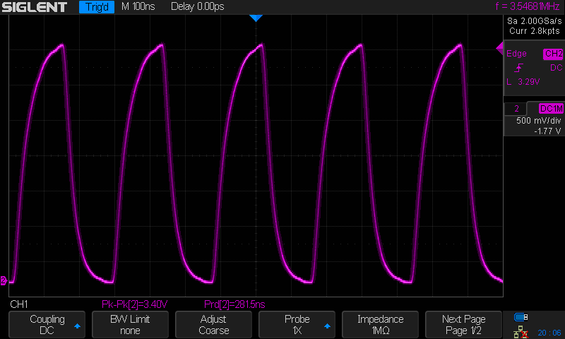 Vypadalo to, že je něco s Alicí. Také se ohříval hodně GAL vedle Alice, který opravuje chyby časování Alice a přidává wait staty pro ROM a k tomu se ještě ohřívaly budiče sběrnice pro PCMCIA kartu. Když jsem Alici ochladil kompresorem, tak to vydrželo bez chyb, restartů a zaseknutí delší dobu. Hodiny CCK (viz foto z osciloskopu) a CCKQ byly v pohodě, při artefaktech se zvýšily asi o 0.1 V. Zvažoval jsem, že zkusím vzít Alici z jedné Amiga desky co tu mám, ale nechtěl ji již po 2 a po 3 tepelně namáhat.