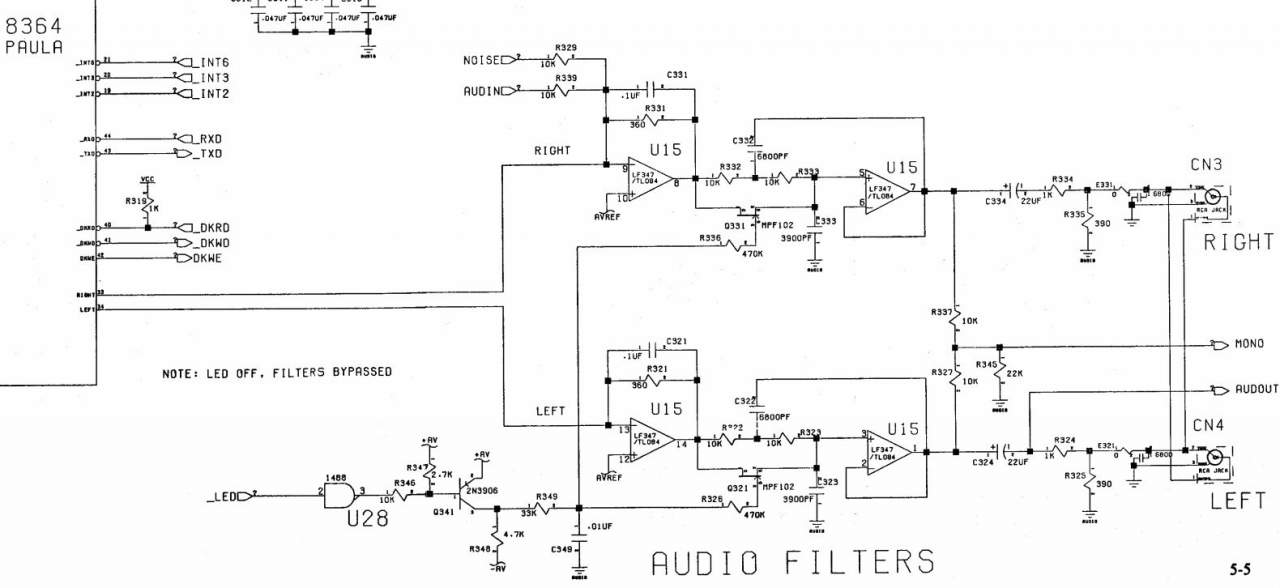 Zkus vytáhnout z konektoru jeden audiokabel, amiga si to umí podle zatížení dorovnat a měl bys slyšet všechny 4 hlasy v tom druhém reproduktoru