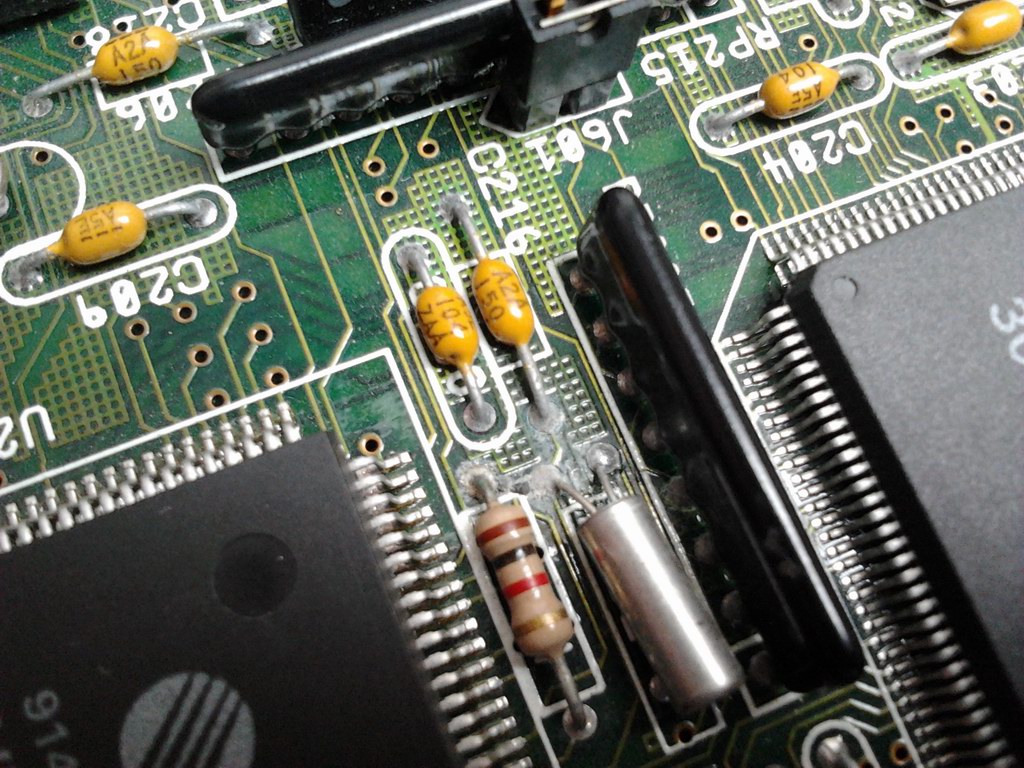 Tady se mi trochu nezdála mírně zoxidovaná oblast. Tak sem ji očistil a spoje u oscilu, kundíku a odporu přepájel.