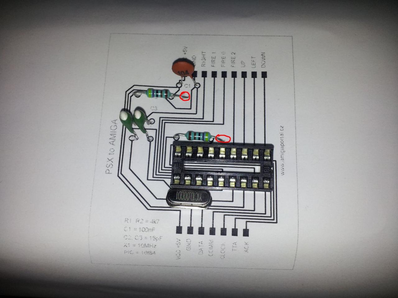 Ano je to blizko, dost zle sa to pajkovalo bez fluxu ale podarilo sa . Na final verzii bude konektor a budem sa snazit vsetky cesty viest mimo vstupno/vystupnych pinov. Bohuzial je to dost tazke na jednej vrstve aspon pre mna. Je to moja prva doska. V buducnosti chcem vlozit maly plosak priamo do joysticku. Len pre uplnost PIC programator na ceste tak uvidim. Mojim dalsim cielom bude Ps2/USB mouse redukcia. Ale iba ak dokoncim toto a Amiga blueprints.