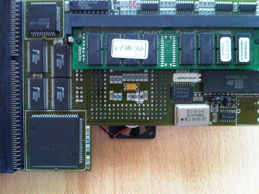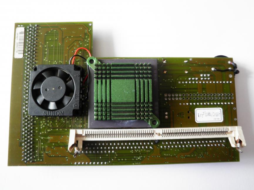 Zdravím všechny, po pár dnech testování Apolla při otevřené Amize jsem se rozhodl odpájet jednu patici na simm, abych mohl Amču zavřít. Bohužel původní chlazení absolutně nestačilo, během 5-ti minut provozu docházelo k vytuhnutí a artefaktům, proto následovala výměna původního pasivu a ventilátoru. Nevím kdo původní chlazení bastlil, ale něco takového se jen tak nevidí. Původní pasiv nalepený sekundovým lepidlem, bohužel s milimetrovou mezerou od procesoru. Ventilátor nalepený nějakou pryskyřici, no prostě hrůza.