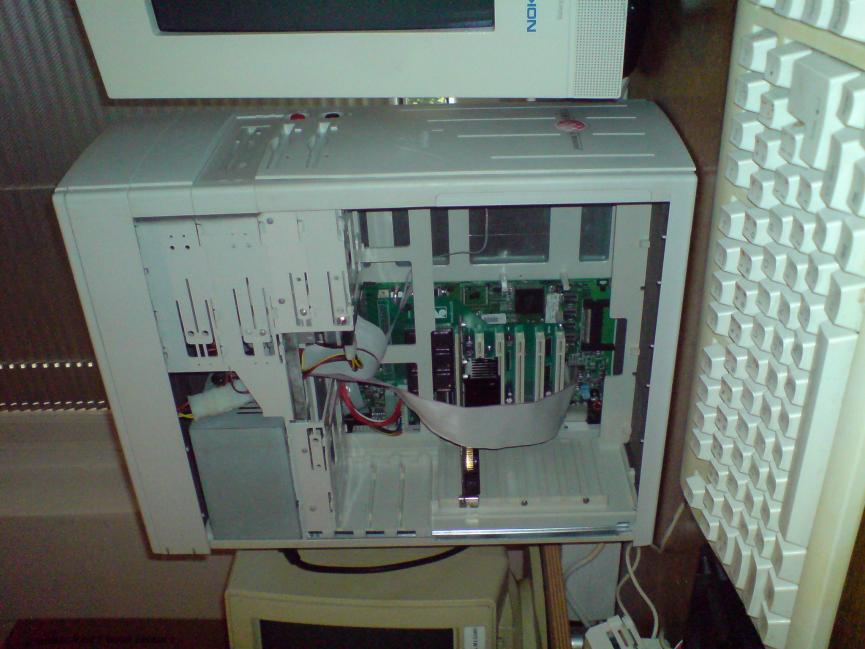 Infinitiv tower (nejspíš poslední revize s hliníkovými výztuhami a hezkým embosovaným boingballem vepředu), hezký bílý, přídané patro, 200 W AT zdroj, z boku však díra ovšem zaplněná tichým ventilátorem (sice dírž do platu nemám rád, ale tohle zase efektivně chladí)
