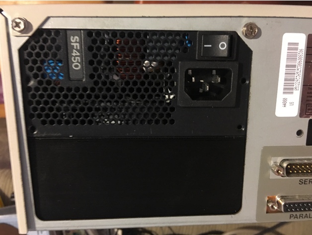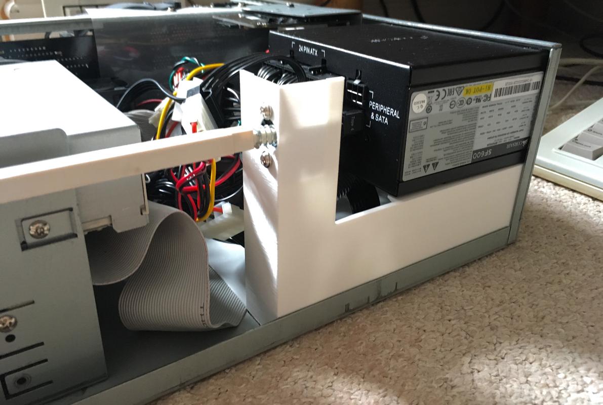 Update: I have uploaded a much smaller file. My design app (Cubify Design) was set up to subdivide curves to an extreme degree, and that was generating a huge file that some people were having trouble slicing.The original power supply on my Amiga 4000 started having voltage fluctuations which a fresh set of capacitors didn't correct. I wanted to move to a small form factor power supply, but due to the way the power switch is integrated into the original Amiga power supply, it meant either running an external switch or modifying the power switch actuator in a way which I don't think is ideal. An SFF would also cause a large air gap at the back of the case, since they are half the height of the original AT supply.This design solves all of those problems. It provides a platform for a small form factor power supply to sit on, it provides an attachment point for a power switch, and it closes up the gap under the SFF power supply at the back of the machine. The open design and air holes on one side allow for better airflow, which should help to reduce the internal temps of the case by a large degree. As a side benefit, the supports of the hard drive caddy rest on top of the power supply, just like the original design. You could technically drill and tap a new hole for the HD mount on the top of the power supply, but I'd rather not go to the trouble and risk getting metal shavings in the supply. I am using a Corsair SFF 450 power supply. I chose that supply because of the modular cables, which help to cut down on clutter by a significant amount.http://www.corsair.com/en-us/sf-series-sf450-450-watt-80-plus-gold-certified-high-performance-sfx-psuI am also using an ATX power supply adapter/switch from Amigakit:http://amigakit.amiga.store/catalog/product_info.php?cPath=39&products_id=615The printed adapter require no supports. I printed mine at .3 layer height and 20% infill, and it appears to be strong. Once the part is printed, you'll want to screw the power switch onto the part as show in the pictures above. The metal tabs on the bottom of the A4000 case then slot into the printed part, just like the original power supply. You can then place the new power supply on top of the printed part and screw it into place. The top 2 screws of the SFF power supply match up to the original power supply screw holes on the A4000 case.