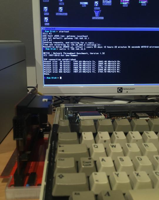 Mit AmiTCP 3.0 ca. 2 MB/s nach RAM: , mit RoadShow ca. 1.7 MB/s.