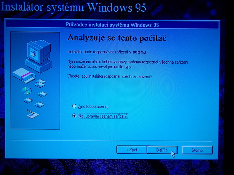 Dôležitá vec je, počas inštalácie pri "Možnosti instalace" zvoliť možnosť "volitelná" a pri "Analyzuje se tento počítač" zvoliť možnosť "Ne, upravím seznam zařízení.". Ak tu zadáte ˇAno", tak pri detekcii zariadení inštalácia Windowsu zamrzne a ďalej nepokračuje. Nižšie uvádzam aj fotky, aby sa vedelo, o ktorú fázu inštalácie ide.