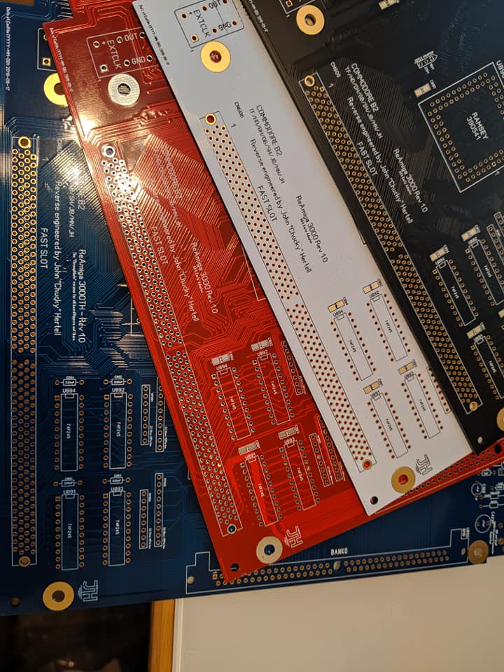 3 Colors of ReAmiga 3000 Black, White and red. this is the A3000 with all passives as SMD. simm socket.. the rest is TH still and some minor changes..