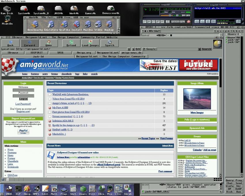 Asi po 10ti letech jsem se s Amigou pripojil na internet. Zatim jedu na IBrowse 2.4 (brouzdat na foru je ale fakt brutus) pac Netsurf mi nejede a OWB zase neumi brouzdat. Ale AmIRC funguje krasne a AmigaAMP umi hrat stream, takze po pul hodine spokojenost.UPDATE: Screenshot pripojen.