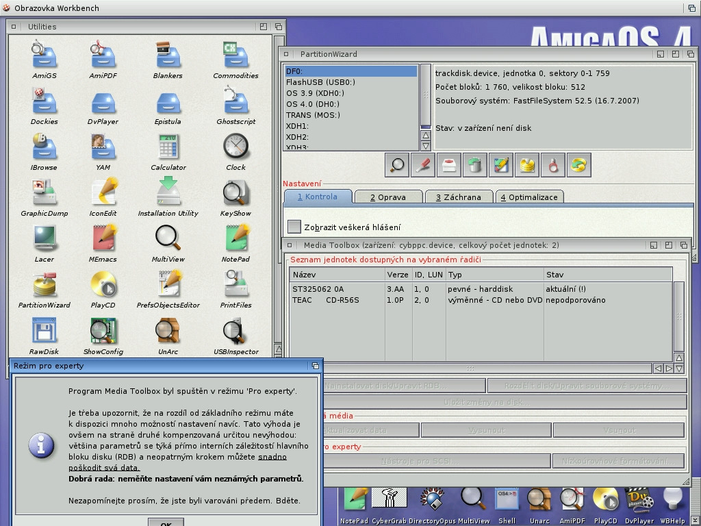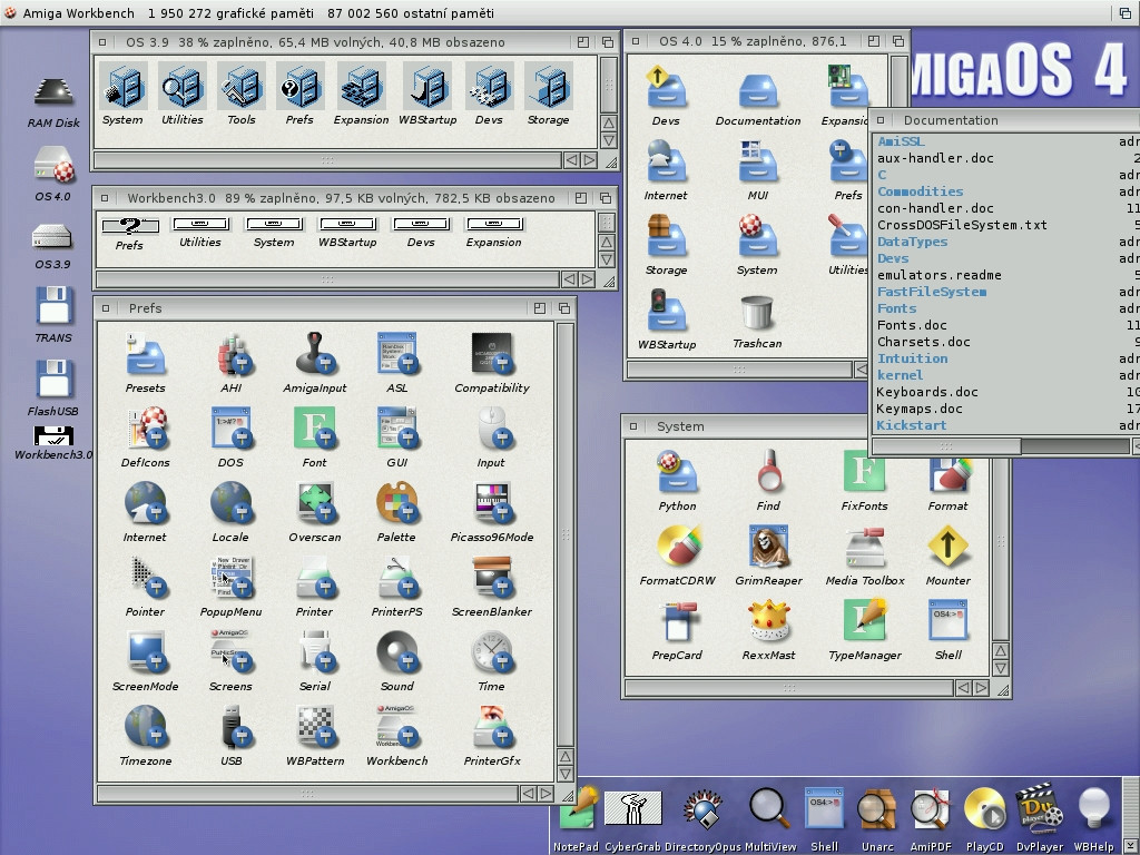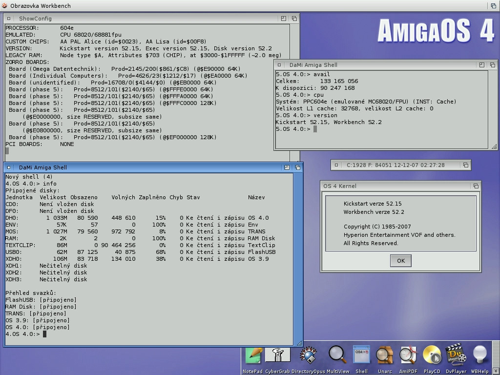 "Coje to za system, WinUAE?"?? Delate si srandu? System je AOS3.9 samo a jestli myslis HW tak to je A1200 v cernym bigtoweru, s cernou CDTV klavesnici, Blizzardem 1260/50 (mam CPU rev.5! , 128MB RAM, Fast ATA 1200, HDD, CD, CD-RW, 2xFDD, Mediator 1200, Voodoo 4 4500 (monitor mam cernej 21" IBM), Sound blaster digital (pres AV Yamaha 5xx class), Ethernet realtek, USB Spider II, a mozna jeste par dalsich veci na ktery jsem zapomel